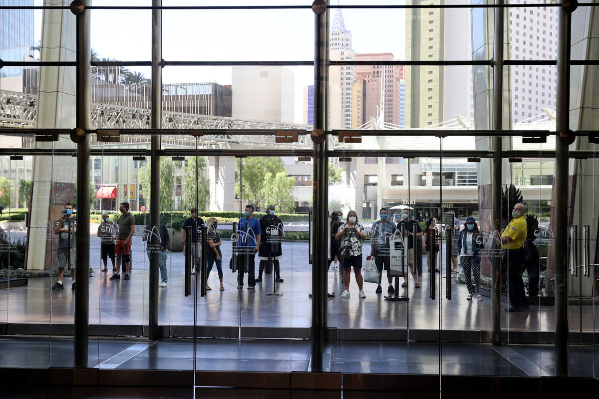 Guests wait outside Aria on the Strip in Las Vegas before reopening Wednesday, July 1, 2020. (K.M. Cannon/Las Vegas Review-Journal) @KMCannonPhoto