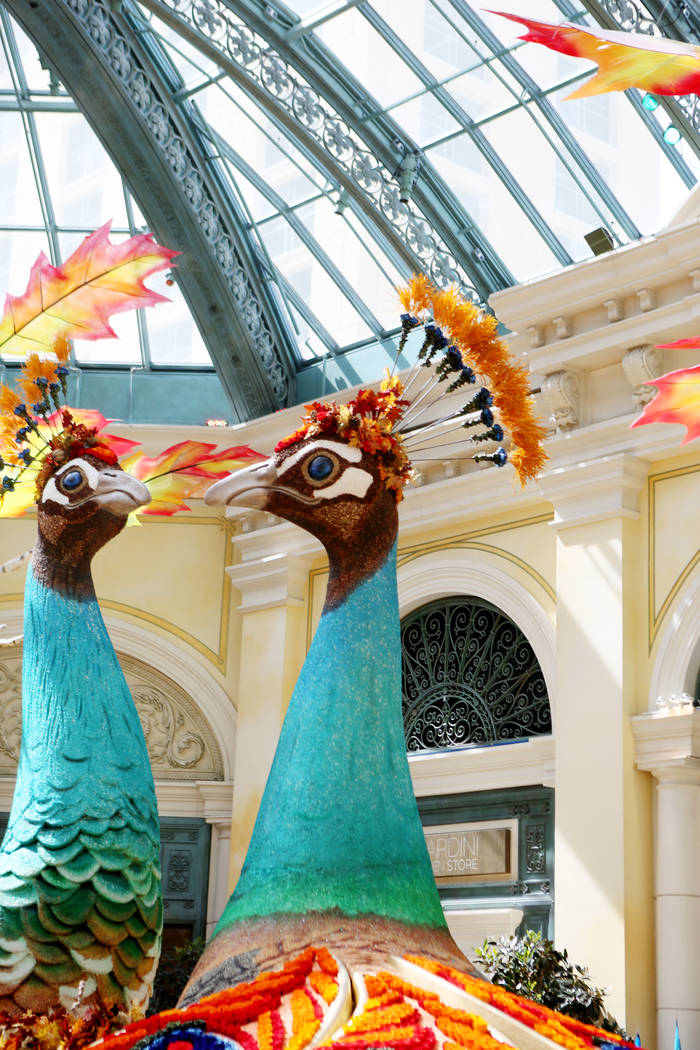 Peacocks both adorned with 14,000 roses inspired by a recent trip to India by renowned designer Ed Libby for the fall display at the Bellagio Conservatory & Botanical Gardens in Las Vegas, Tuesday, Sept. 19, 207. (Elizabeth Brumley/Las Vegas Review-Journal)