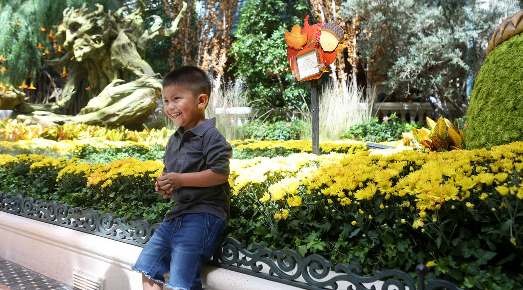 Salvador Siliezar, 3, is photographed by his mom by the fall display inspired by a recent trip to India by renowned designer Ed Libby, at the Bellagio Conservatory & Botanical Gardens in Las Vegas, Tuesday, Sept. 19, 207. (Elizabeth Brumley/Las Vegas Review-Journal)