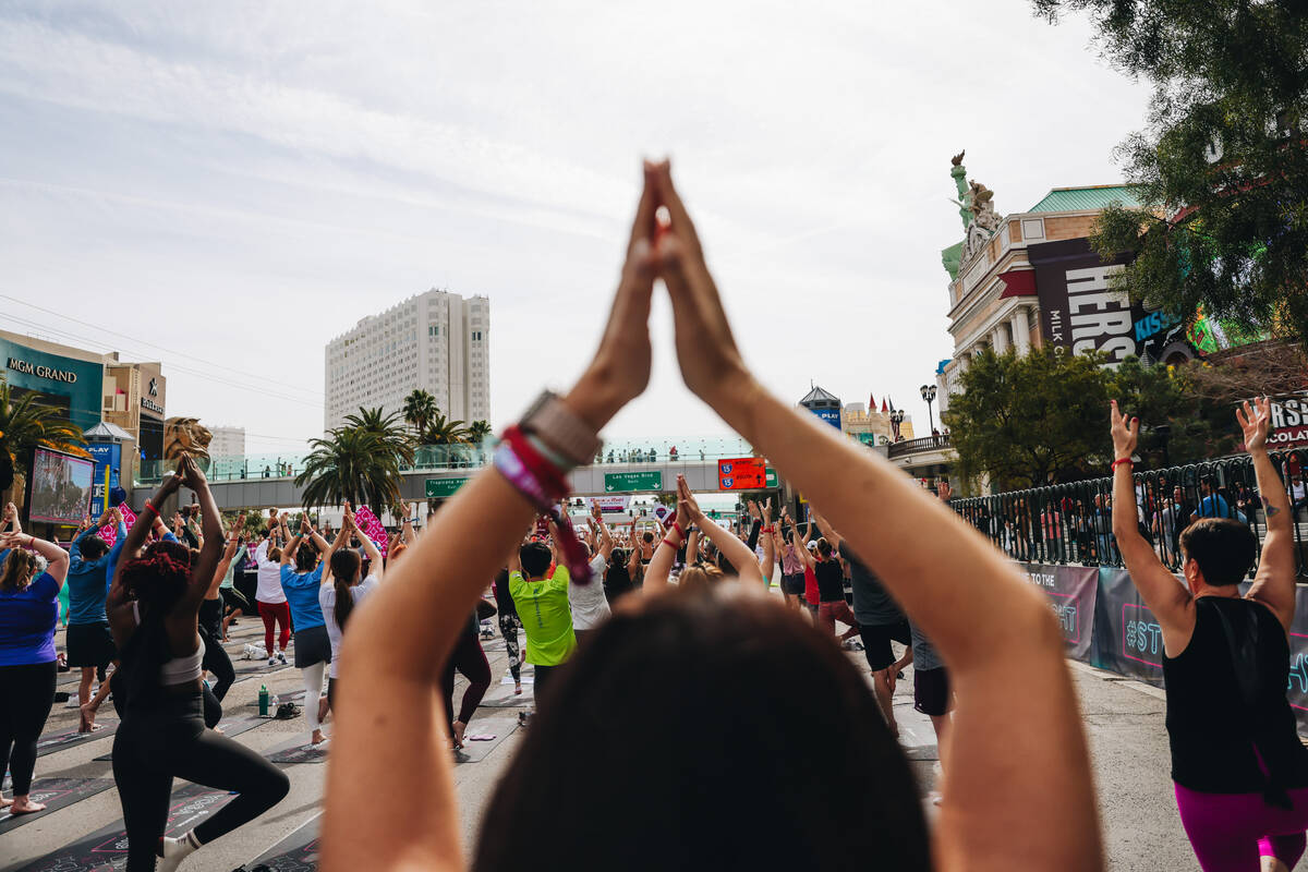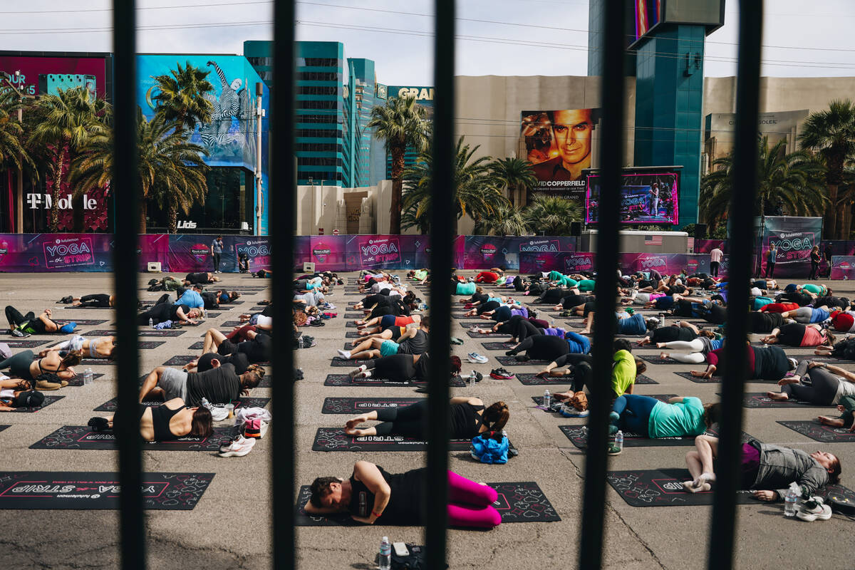 About 100 people gathered for the rare opportunity to practice yoga on Las Vegas Boulevard while it was shut down for the Rock ‘n’ Roll Running Series. The event, which featured exclusive yoga mats, was sold out and sponsored by Lululemon.