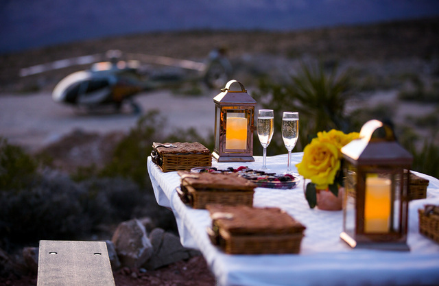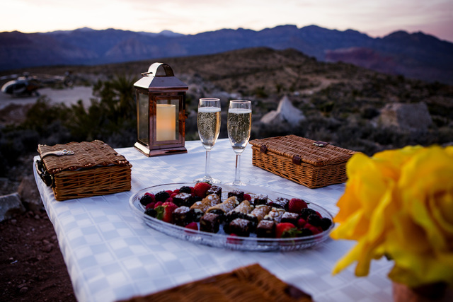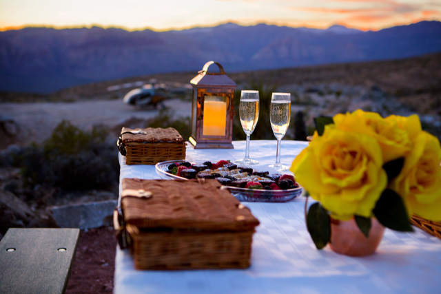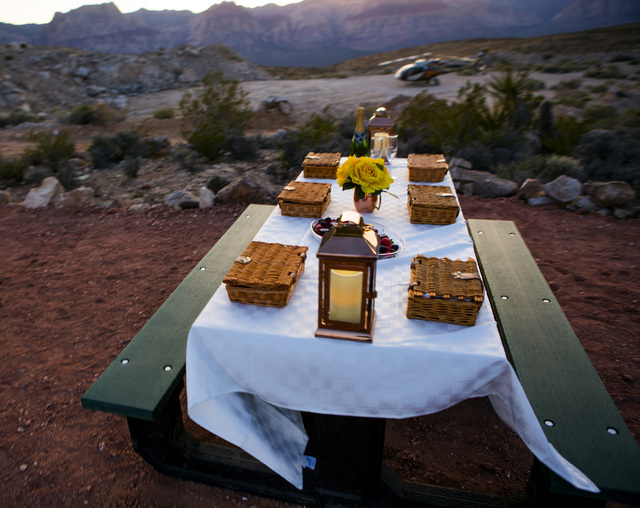 Upon landing, the pilot escorts the travelers up a winding path that leads to two picnic tables that overlook the Las Vegas Valley.