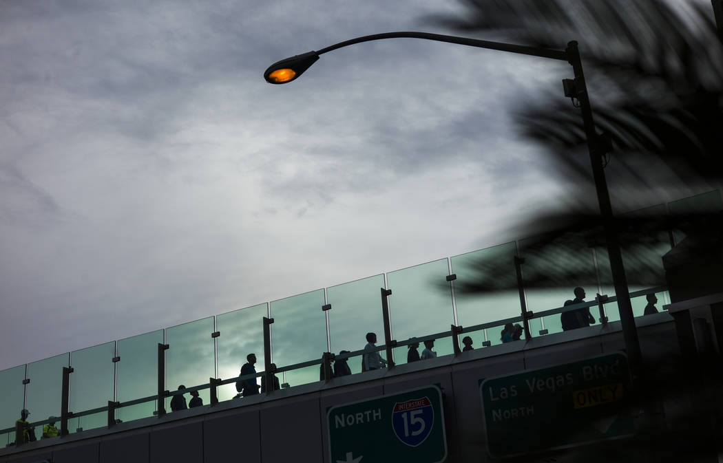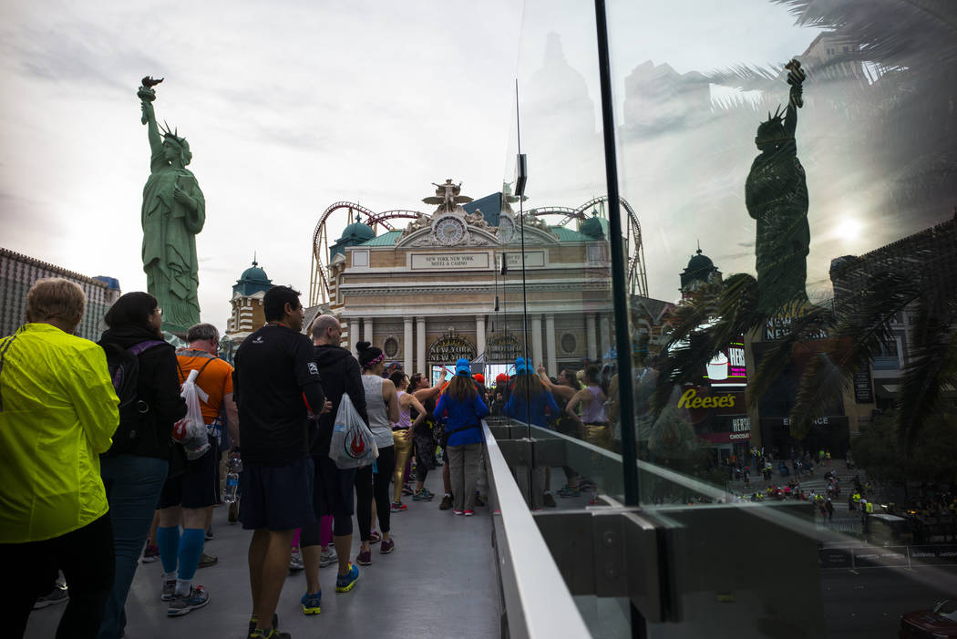 People crowd a pedestrian bridge at Las Vegas Boulevard and Tropicana Avenue before the start of the Rock ‘n’ Roll Marathon in Las Vegas on Sunday, Nov. 12, 2017. Chase Stevens Las Vegas Review-Journal @csstevensphoto