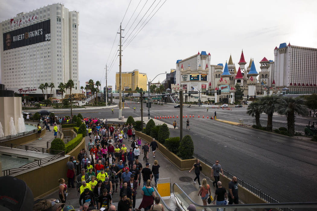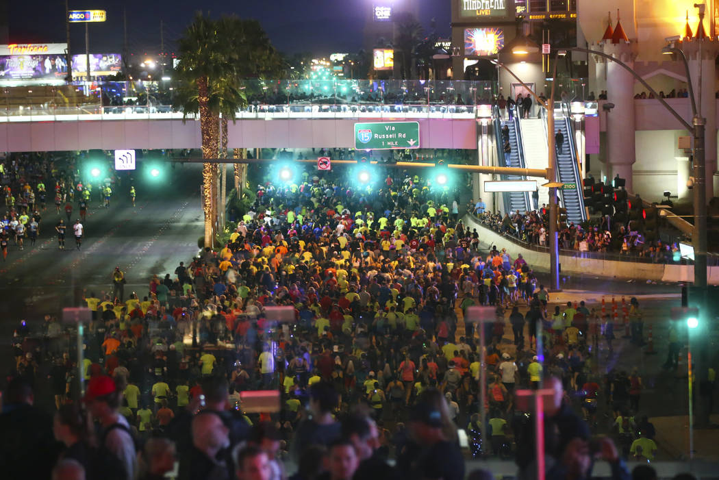 People crowd the intersection of Las Vegas Boulevard and Tropicana Avenue as race participants prepare for the start of the Rock ‘n’ Roll Marathon in Las Vegas on Sunday, Nov. 12, 2017. Chase Stevens Las Vegas Review-Journal @csstevensphoto