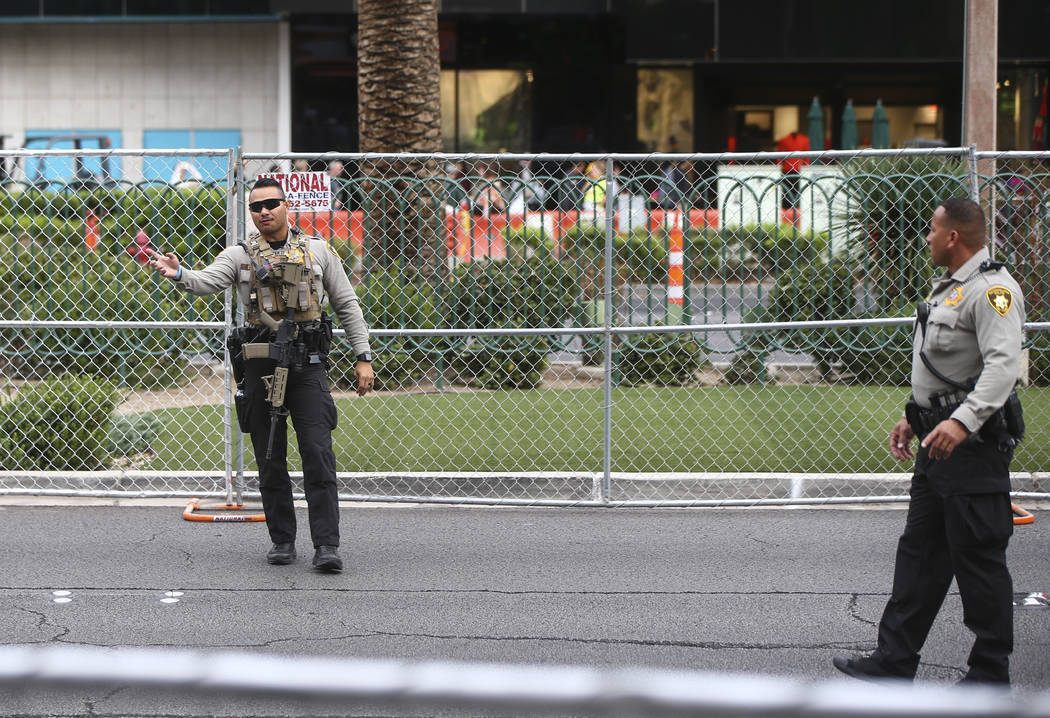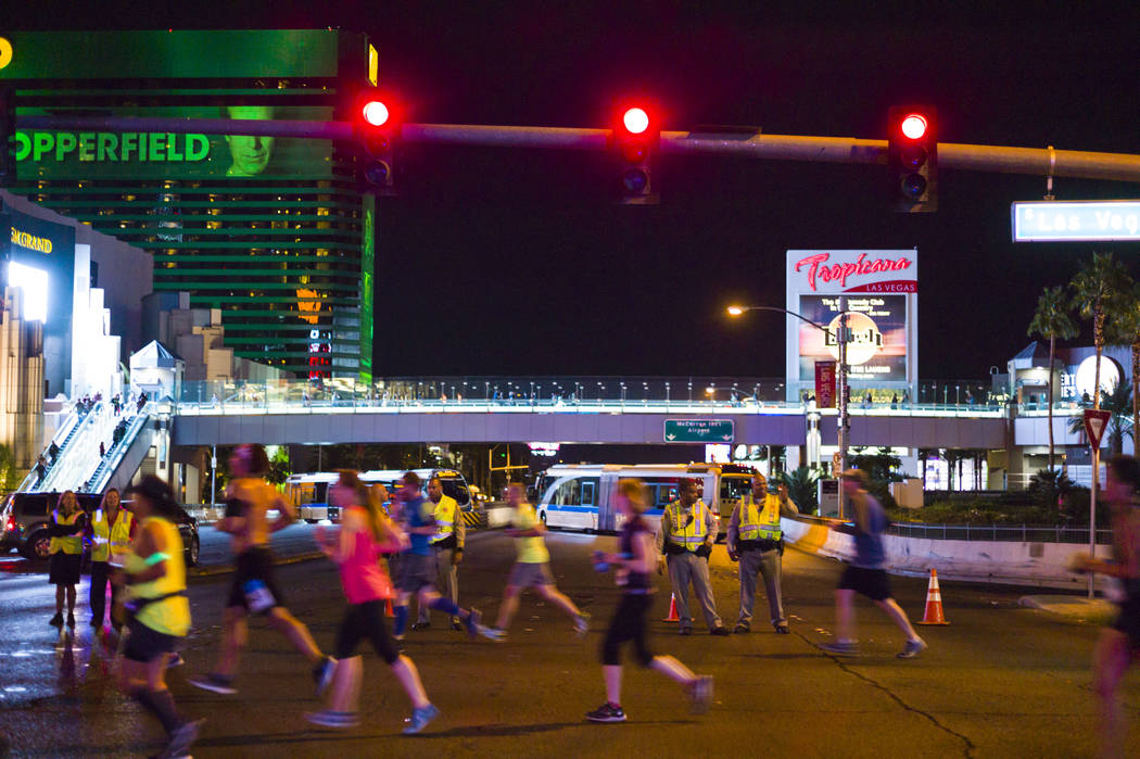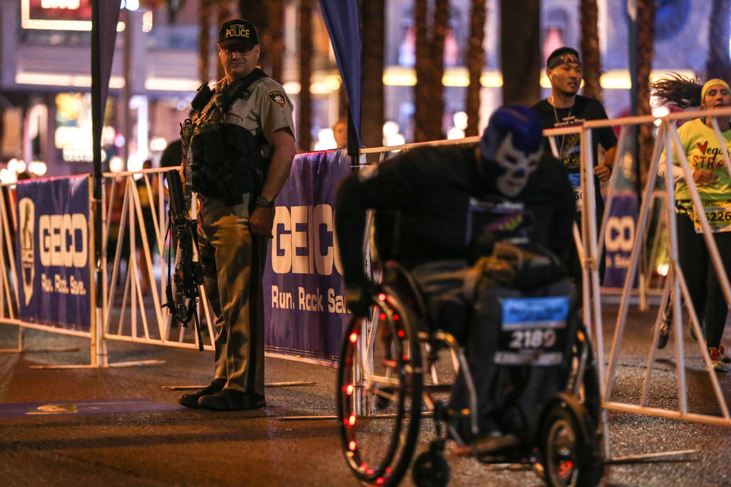 Las Vegas police officers watch as race participants pass by Tropicana Avenue during the Rock ‘n’ Roll Marathon in Las Vegas on Sunday, Nov. 12, 2017. Chase Stevens Las Vegas Review-Journal @csstevensphoto