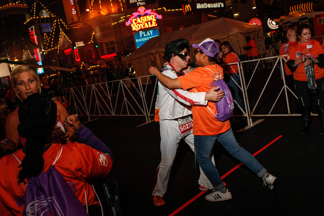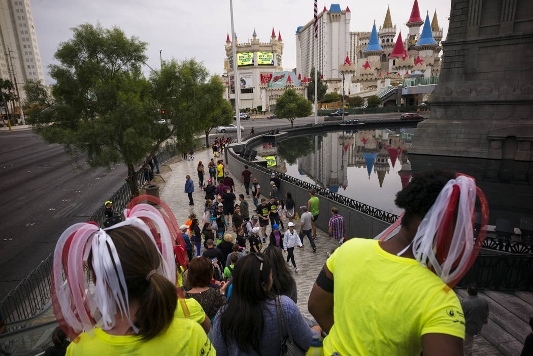 Amanda Bailey, left, and Girldy Janiton (cq), both of the Montreal, Canada area, take in the scene before the start of the Rock ‘n’ Roll Marathon outside of the New York New York in Las Vegas on Sunday, Nov. 12, 2017. Chase Stevens Las Vegas Review-Journal @csstevensphoto