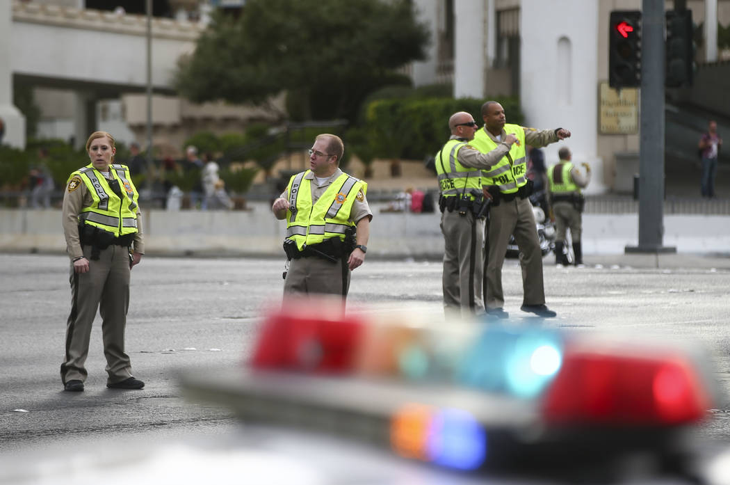 Las Vegas police officers help shut down the Las Vegas Strip to traffic before the start of the Rock ‘n’ Roll Marathon in Las Vegas on Sunday, Nov. 12, 2017. Chase Stevens Las Vegas Review-Journal @csstevensphoto