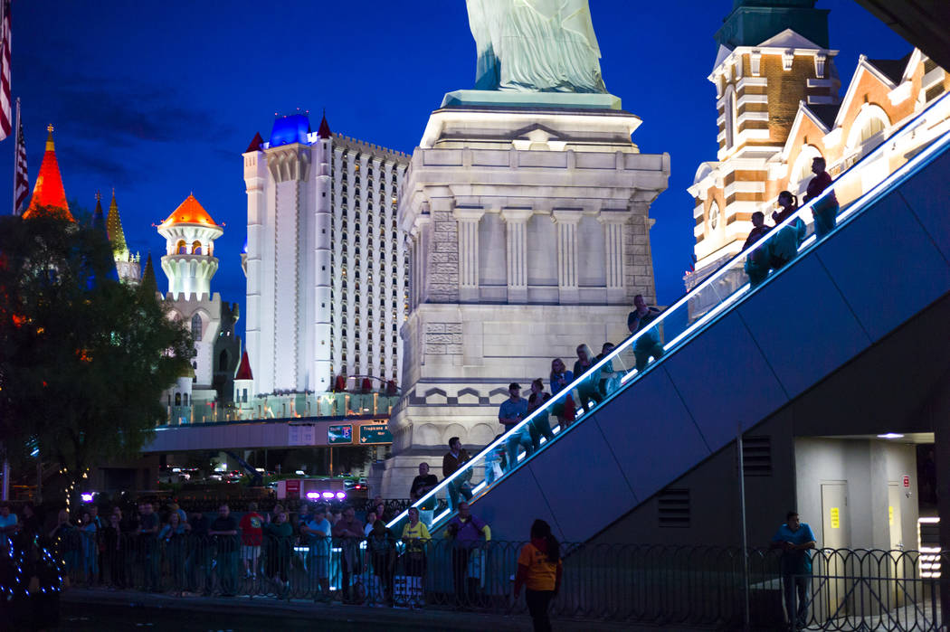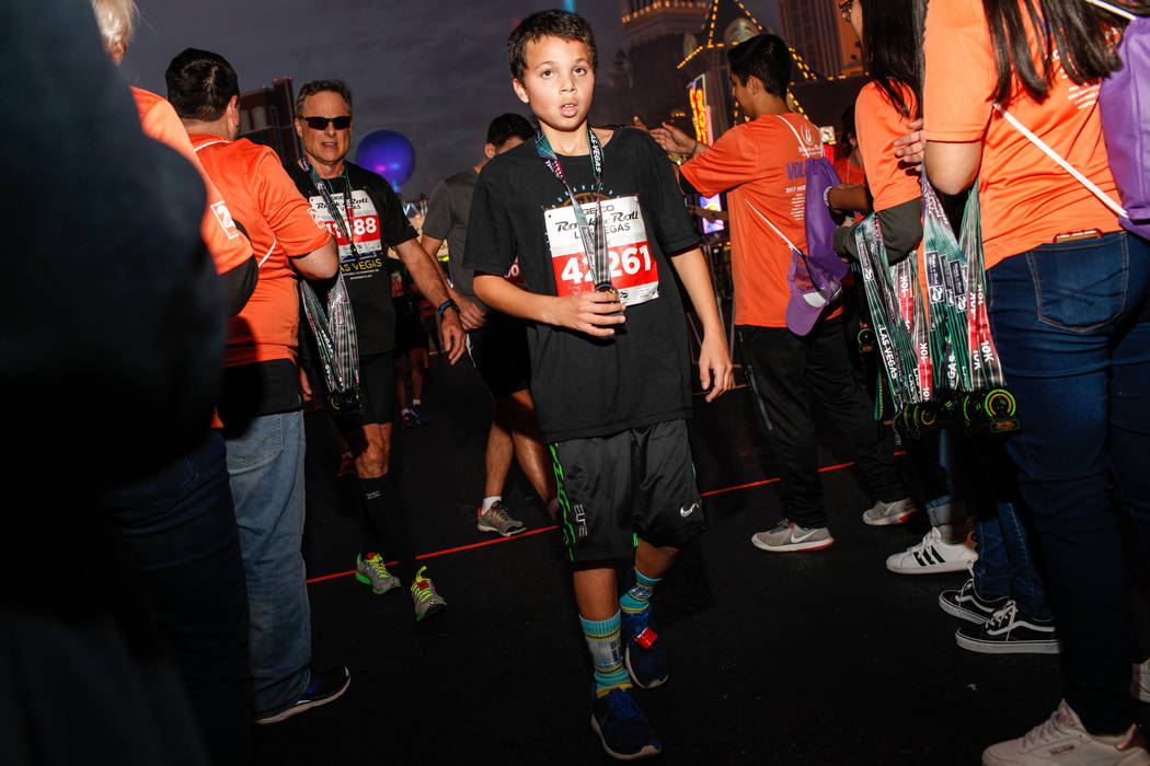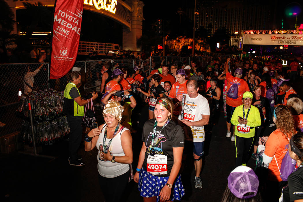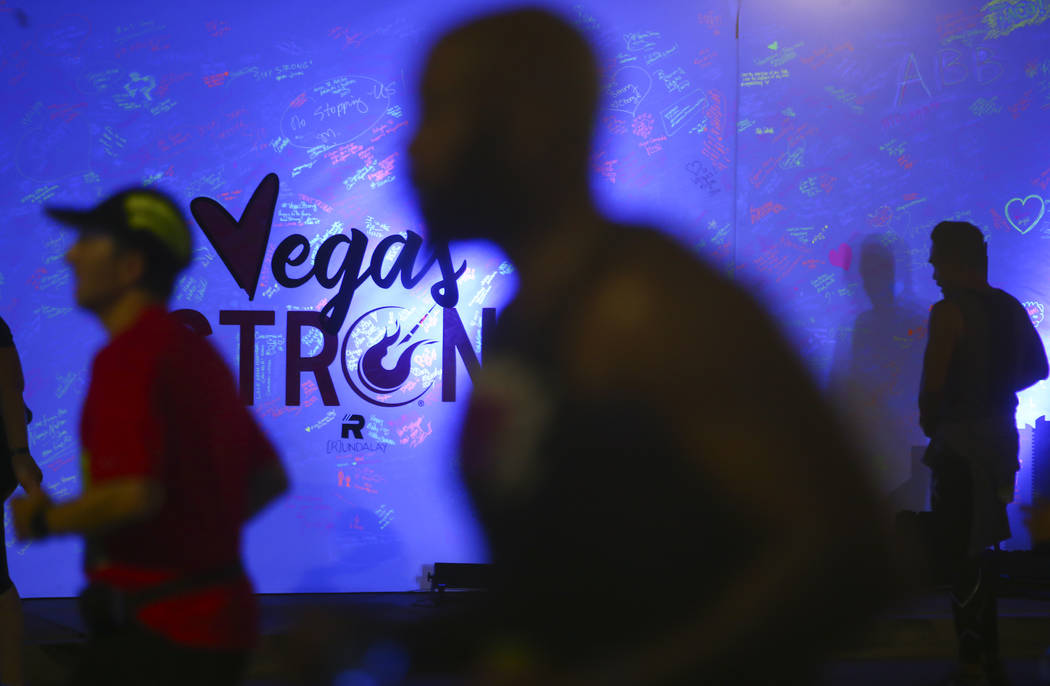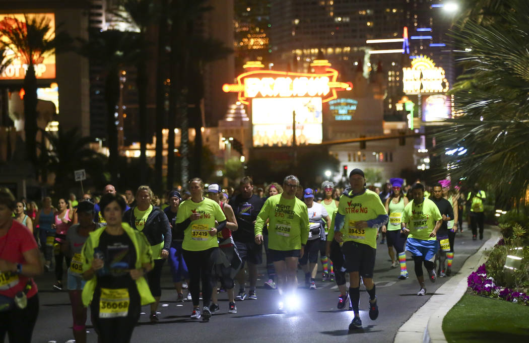 Many runners wore the Rock ‘n’ Roll Series’ “Vegas Strong” shirts. On a 2½-mile section of the course, runners made their way past Mandalay Bay and Las Vegas Village with no live music, which served as an extended moment of silence.