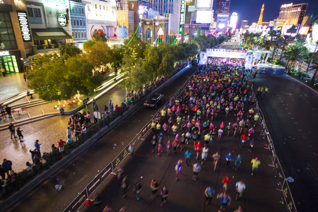 Participants head out from the start line outside of the New York-New York at the beginning of the Rock ‘n’ Roll Marathon in Las Vegas on Sunday, Nov. 12, 2017. Chase Stevens Las Vegas Review-Journal @csstevensphoto