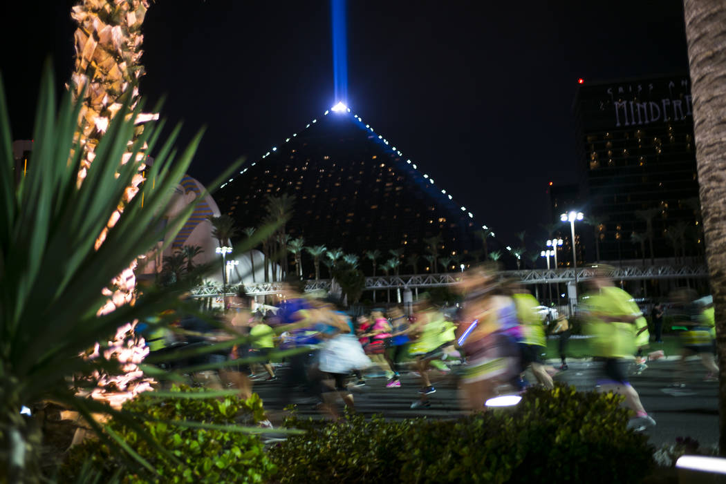 Race participants pass by the Luxor during the Rock ‘n’ Roll Marathon in Las Vegas on Sunday, Nov. 12, 2017. Chase Stevens Las Vegas Review-Journal @csstevensphoto