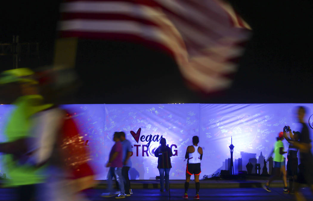 Race participants pass a memorial wall in honor of victims of the Oct. 1 shooting during the Rock ‘n’ Roll Marathon in Las Vegas on Sunday, Nov. 12, 2017. Chase Stevens Las Vegas Review-Journal @csstevensphoto