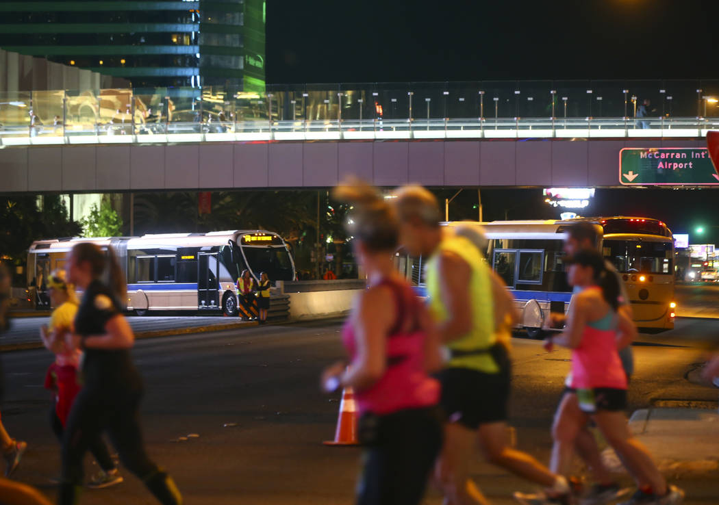 Busses block Tropicana Avenue at Las Vegas Boulevard as race participants pass by during the Rock ‘n’ Roll Marathon in Las Vegas on Sunday, Nov. 12, 2017. Chase Stevens Las Vegas Review-Journal @csstevensphoto