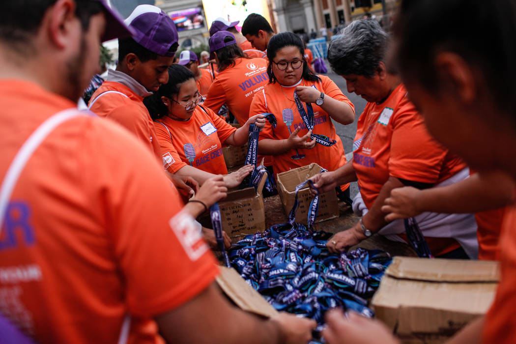 Charlene Gamayo, 16, of Las Vegas, third from right, assembles medals for runners in the Rock ‘n’ Roll Las Vegas Marathon along the Strip near The Mirage in Las Vegas, Sunday, Nov. 12, 2017. Joel Angel Juarez Las Vegas Review-Journal @jajuarezphoto