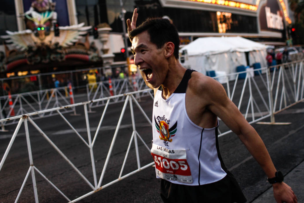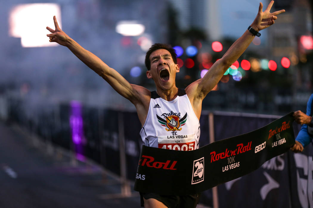 Matthew Liaw of Crownpoint crosses the finish line winning the 10K men’s run of the Rock ‘n’ Roll Las Vegas Marathon along the Strip near The Mirage in Las Vegas, Sunday, Nov. 12, 2017. Joel Angel Juarez Las Vegas Review-Journal @jajuarezphoto