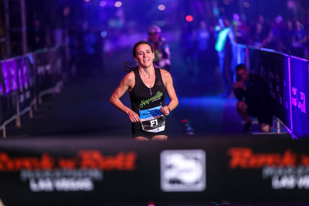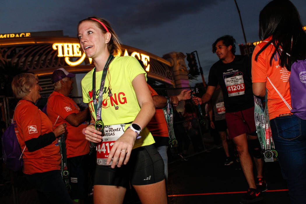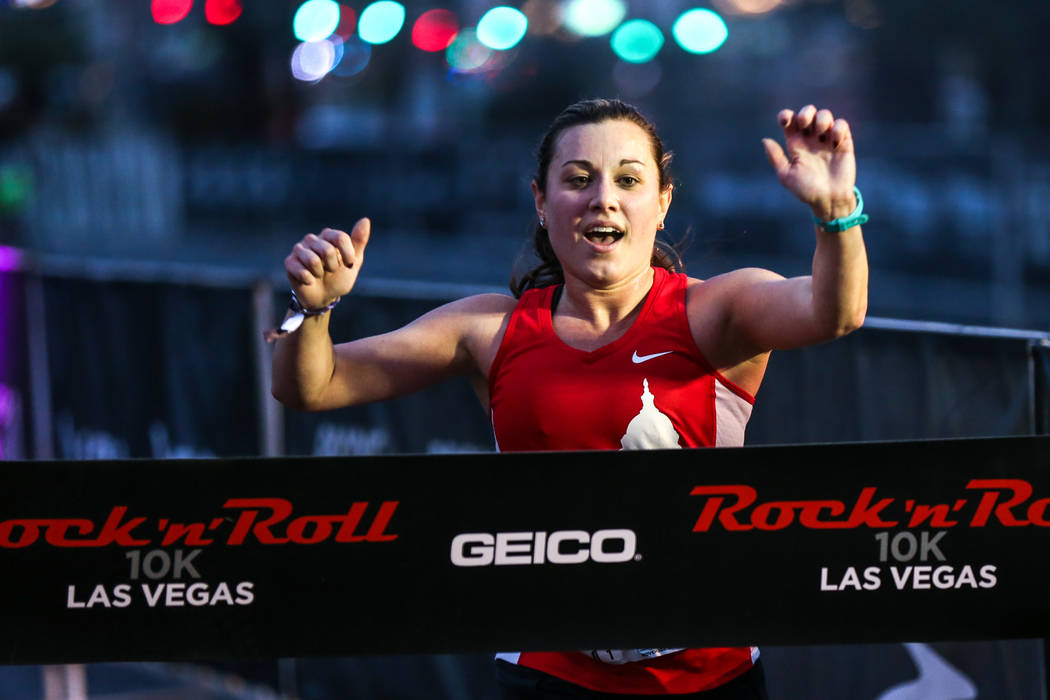 Kayla Hohlt of Austin crosses the finish line at the 10K run of the Rock ‘n’ Roll Las Vegas Marathon along the Strip near The Mirage in Las Vegas, Sunday, Nov. 12, 2017. Joel Angel Juarez Las Vegas Review-Journal @jajuarezphoto