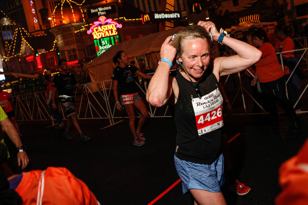 Catherine Baran of Sandspit crosses the finish line at the 10K run of the Rock ‘n’ Roll Las Vegas Marathon along the Strip near The Mirage in Las Vegas, Sunday, Nov. 12, 2017. Joel Angel Juarez Las Vegas Review-Journal @jajuarezphoto