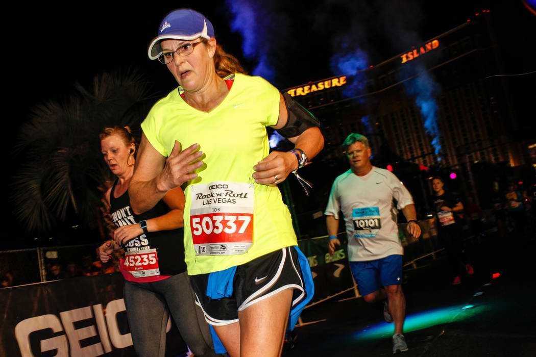 Cathy Hanehan of Saratoga Springs, center, crosses the finish line at the 10K run of the Rock ‘n’ Roll Las Vegas Marathon along the Strip near The Mirage in Las Vegas, Sunday, Nov. 12, 2017. Joel Angel Juarez Las Vegas Review-Journal @jajuarezphoto