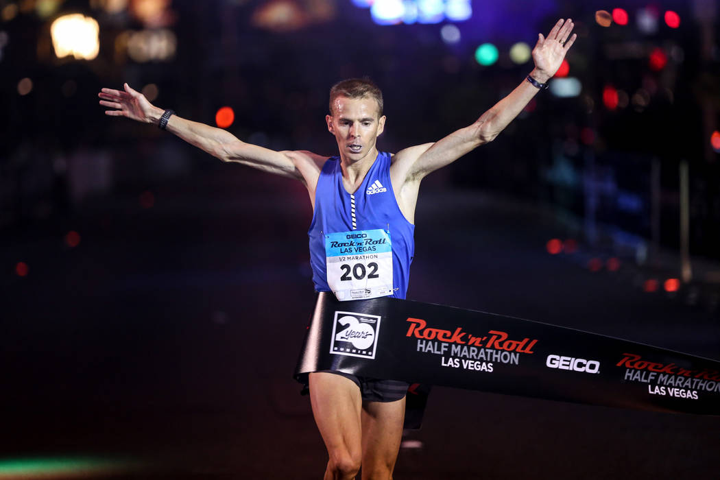 Jeffrey Eggleston of Boulder crosses the finish line for first place of the men’s half marathon run of the Rock ‘n’ Roll Las Vegas Marathon along the Strip near The Mirage in Las Vegas, Sunday, Nov. 12, 2017. Joel Angel Juarez Las Vegas Review-Journal @jajuarezphoto
