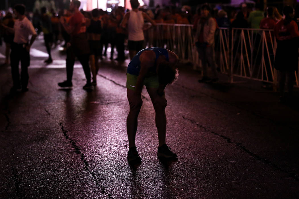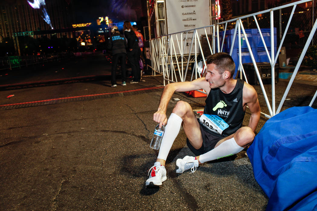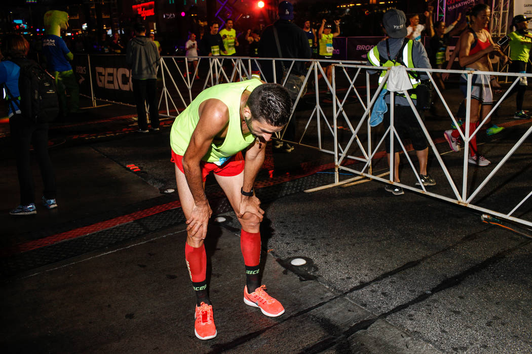 Marek Hladik of Bratislava catches his breath after crossing the finish line at the half marathon run of the Rock ‘n’ Roll Las Vegas Marathon along the Strip near The Mirage in Las Vegas, Sunday, Nov. 12, 2017. Joel Angel Juarez Las Vegas Review-Journal @jajuarezphoto