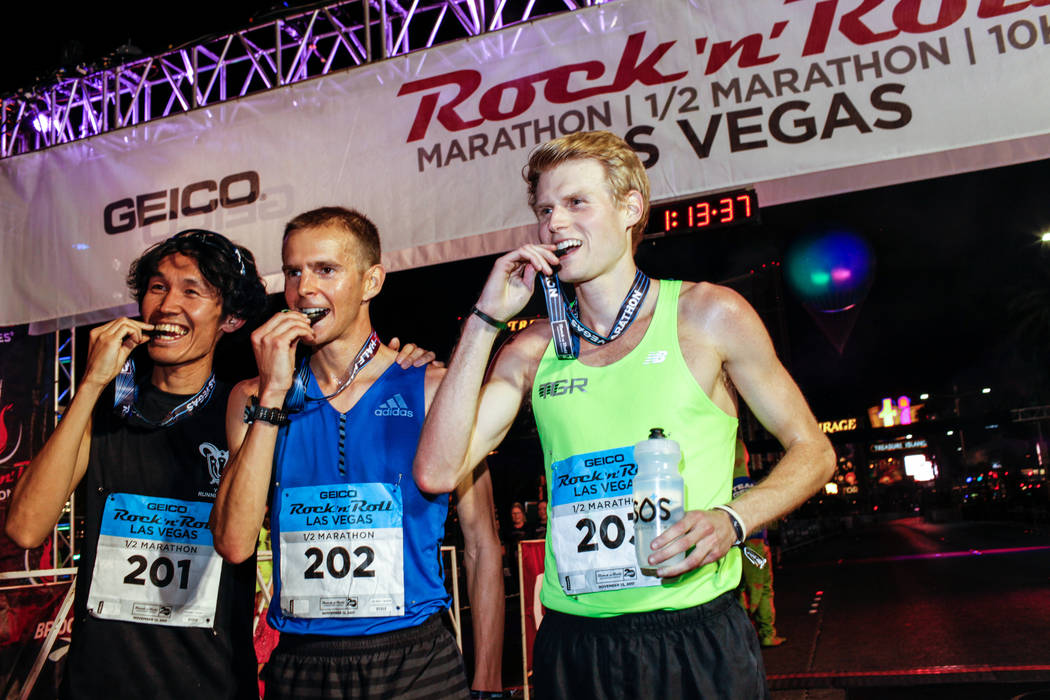 Second place winner Yuki Yagi of Japan, left, first place winner Jeffrey Eggleston of Boulder, center, and third place winner Wilkerson Given of the Woodlands, right, bite their medals after crossing the finish line at the men’s half marathon run of the Rock ‘n’ Roll Las Vegas Marathon along the Strip near The Mirage in Las Vegas, Sunday, Nov. 12, 2017. Joel Angel Juarez Las Vegas Review-Journal @jajuarezphoto