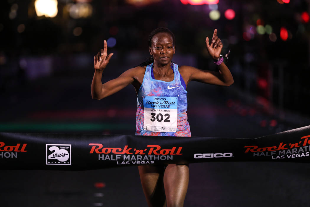 Janet Bawcom of Flagstaff crosses the finish line for first place at the women’s half marathon run of the Rock ‘n’ Roll Las Vegas Marathon along the Strip near The Mirage in Las Vegas, Sunday, Nov. 12, 2017. Joel Angel Juarez Las Vegas Review-Journal @jajuarezphoto