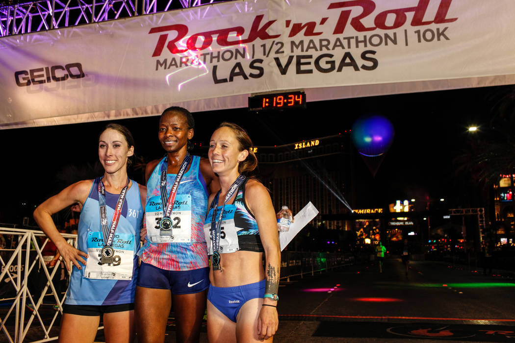 Second place winner Sarah Crouch, left, first place winner Janet Bawcom, and third place winner Georgia Porter, right, all of Flagstaff, gather for a photograph after completing the women’s half marathon run of the Rock ‘n’ Roll Las Vegas Marathon along the Strip near The Mirage in Las Vegas, Sunday, Nov. 12, 2017. Joel Angel Juarez Las Vegas Review-Journal @jajuarezphoto