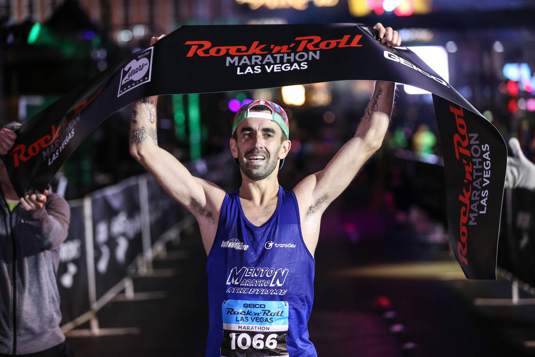 Gilles Rubio of Roquebrune Cap Martin, France, crosses the finish line winning first place at the men’s marathon run of the Rock ‘n’ Roll Las Vegas Marathon along the Strip near The Mirage in Las Vegas, Sunday, Nov. 12, 2017. Joel Angel Juarez Las Vegas Review-Journal @jajuarezphoto