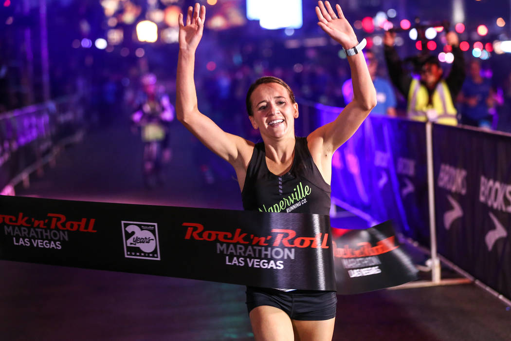 Marisa Hird of Naperville, Illinois crosses the finish line winning first place at the women’s marathon run of the Rock ‘n’ Roll Las Vegas Marathon along the Strip near The Mirage in Las Vegas, Sunday, Nov. 12, 2017. Joel Angel Juarez Las Vegas Review-Journal @jajuarezphoto