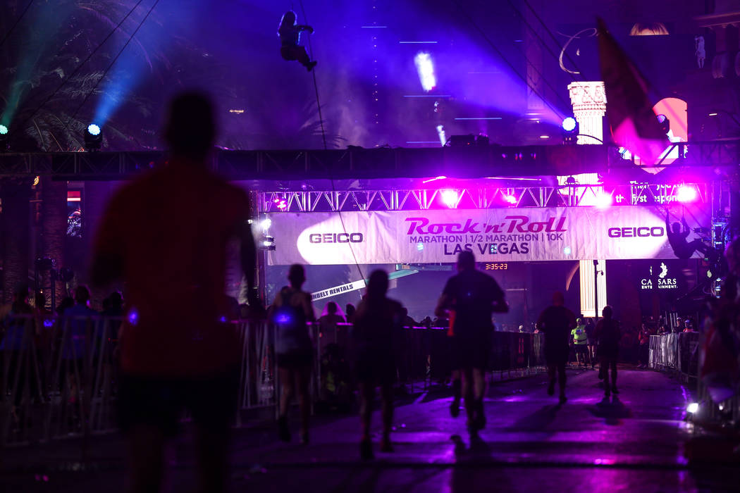 Runners cross the finish line at the half marathon run of the Rock ‘n’ Roll Las Vegas Marathon along the Strip near The Mirage in Las Vegas, Sunday, Nov. 12, 2017. Joel Angel Juarez Las Vegas Review-Journal @jajuarezphoto