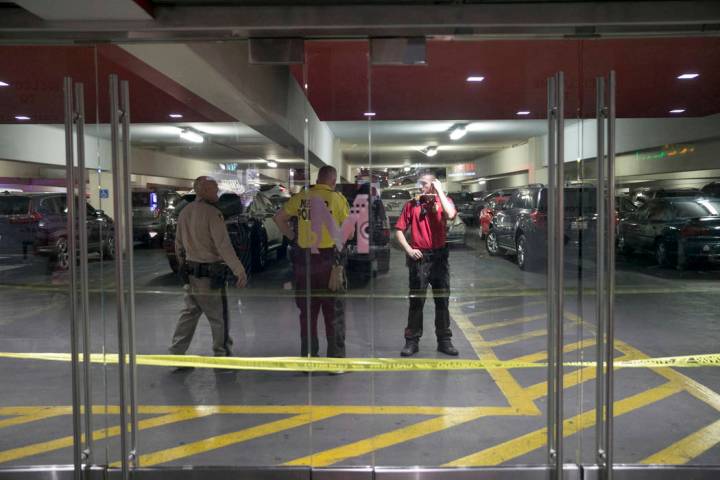 Two security guards were shot — one in the hand, one in the neck — Thursday night after chasing robbery suspects into a parking garage on the Las Vegas Strip, Metropolitan Police Department said.