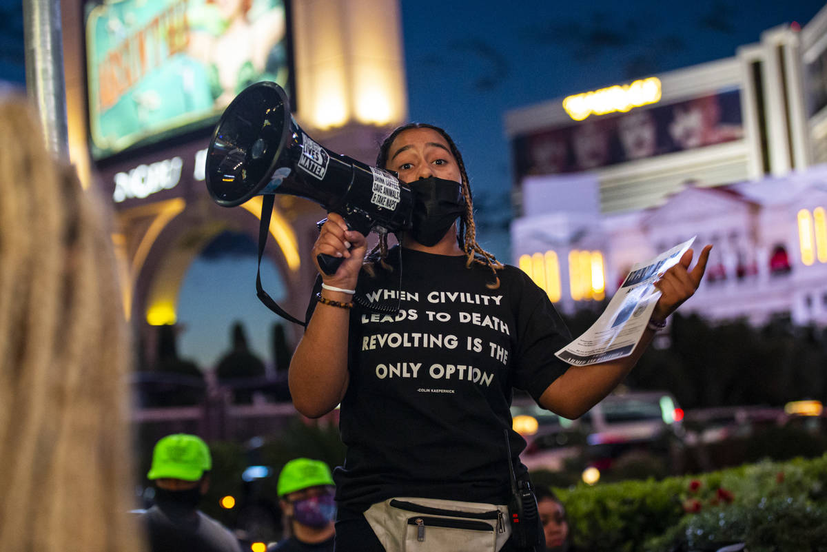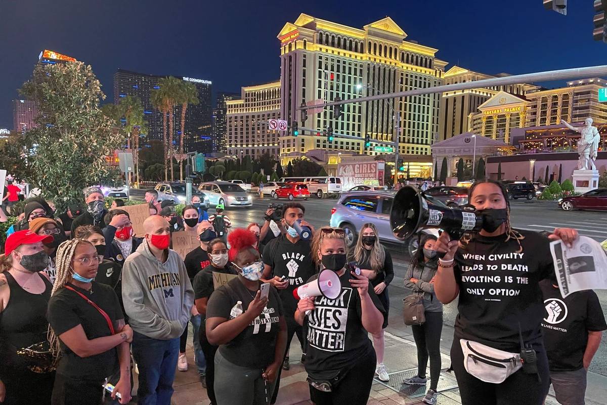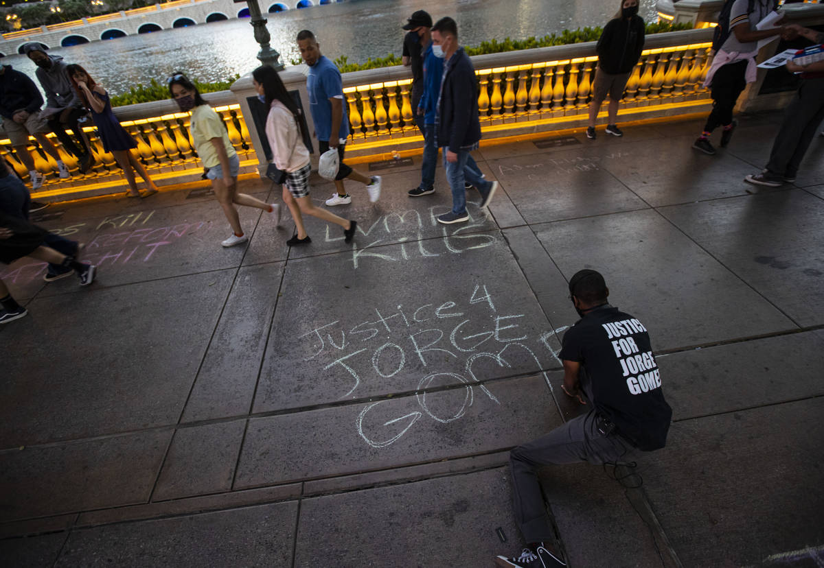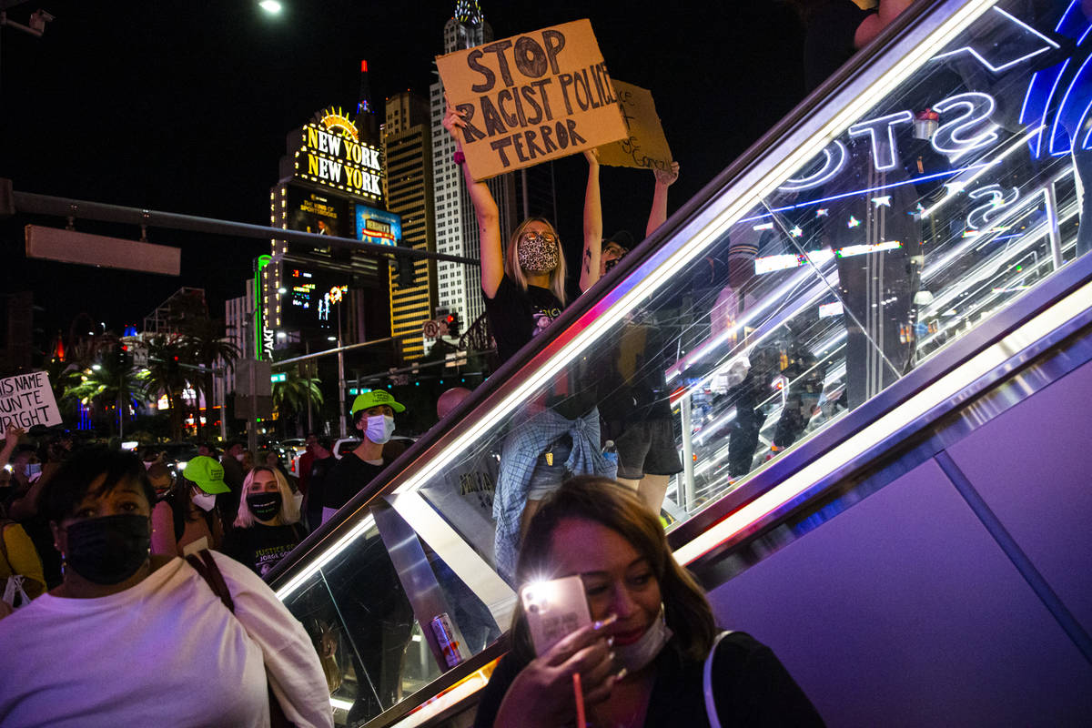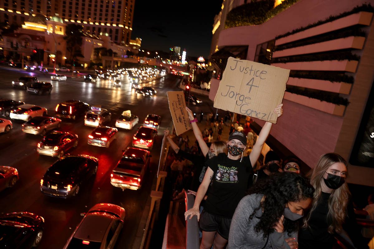 More than 100 people gathered under the lights of the Strip on Saturday night to protest recent police killings in the U.S. and the Clark County district attorney’s preliminary decision in the death of Jorge Gomez in Las Vegas.