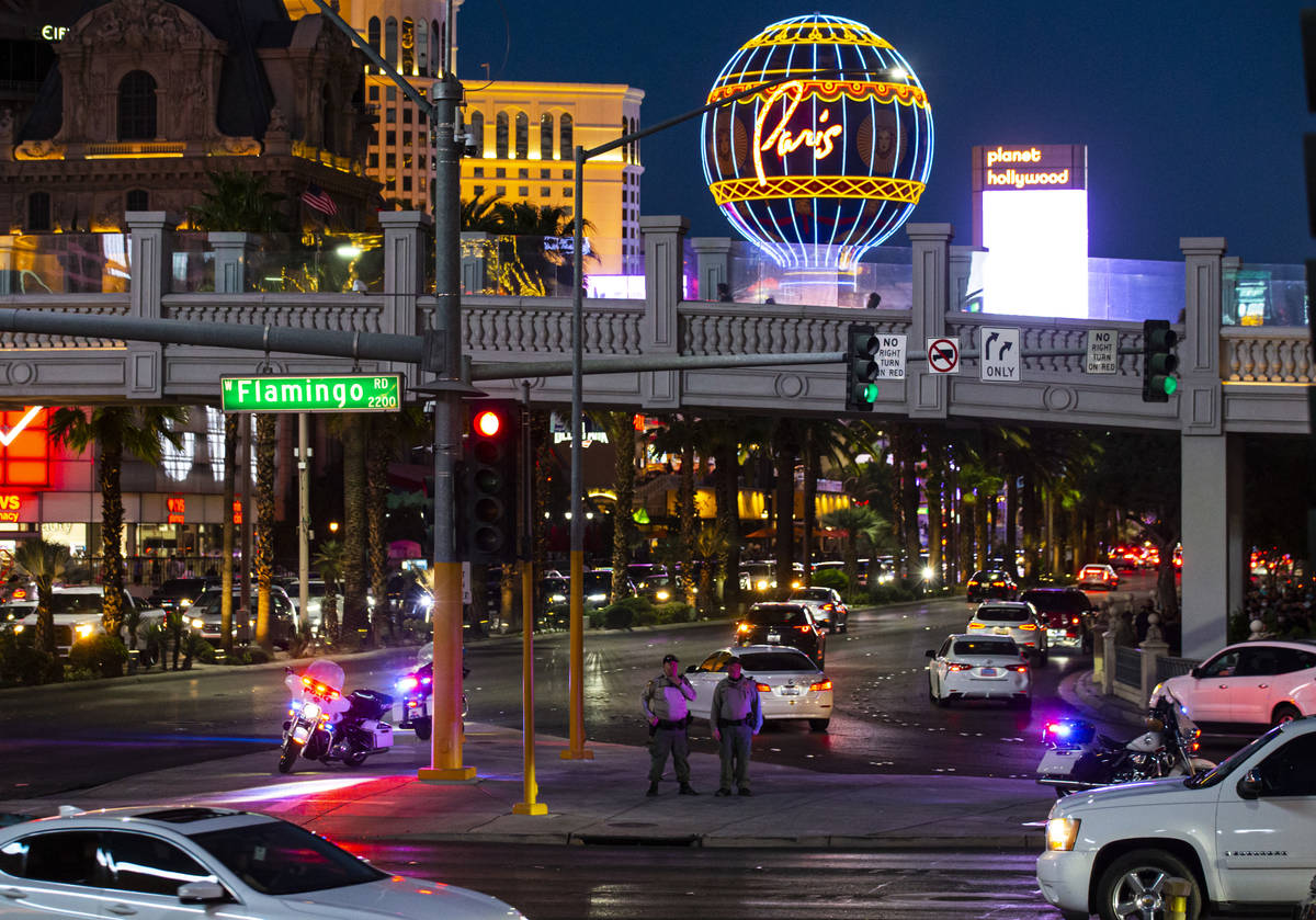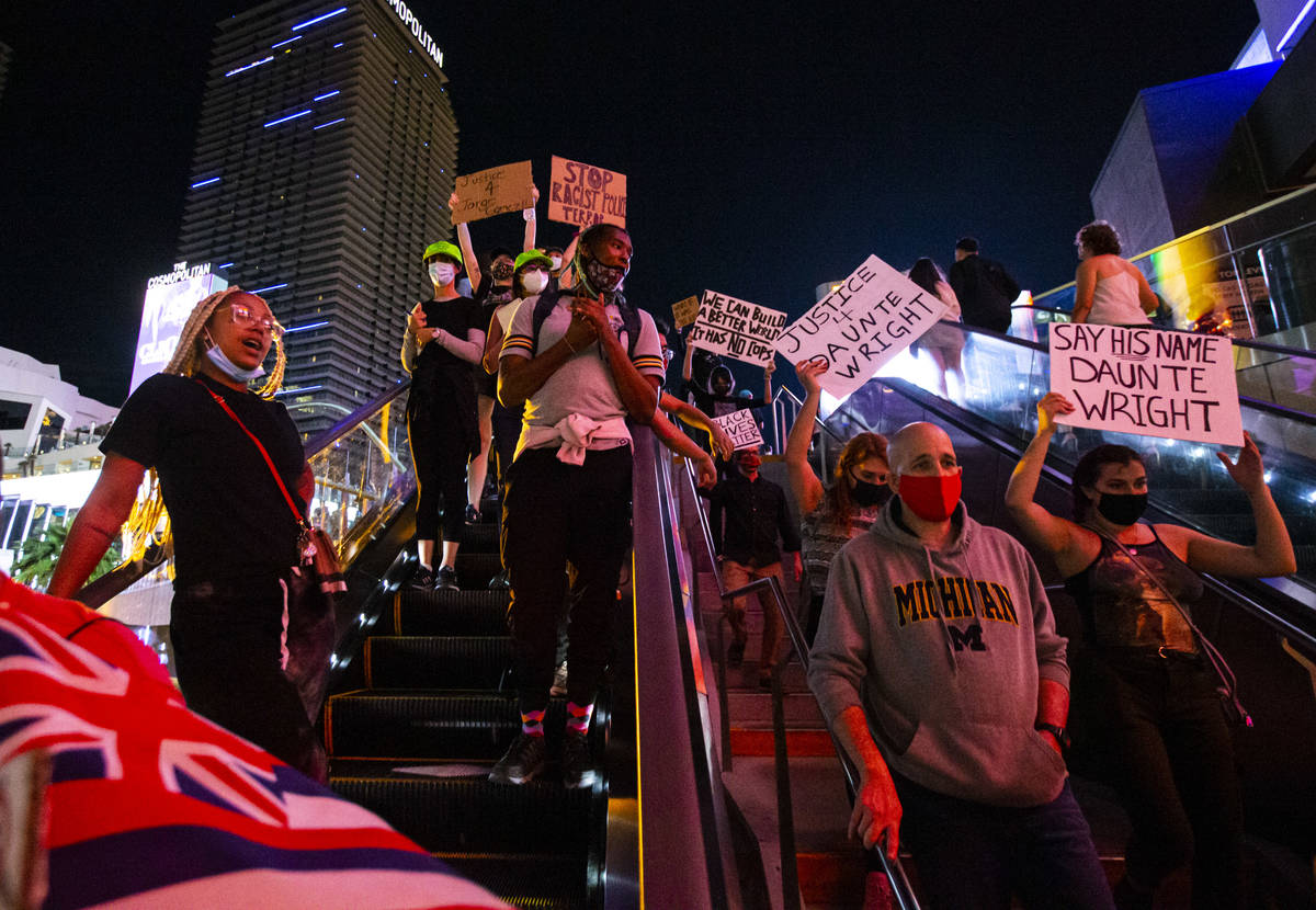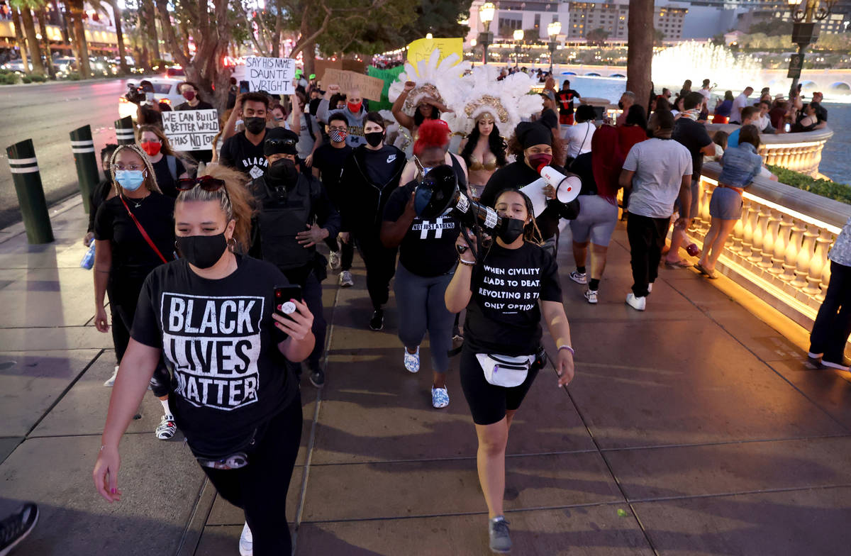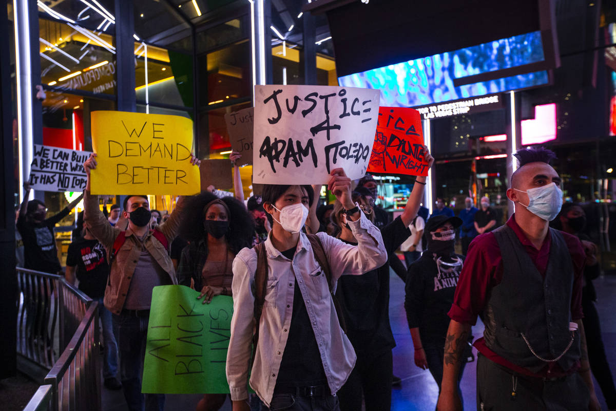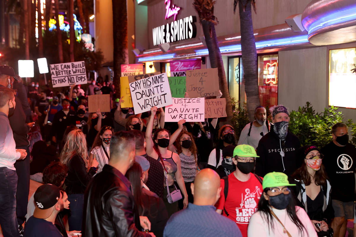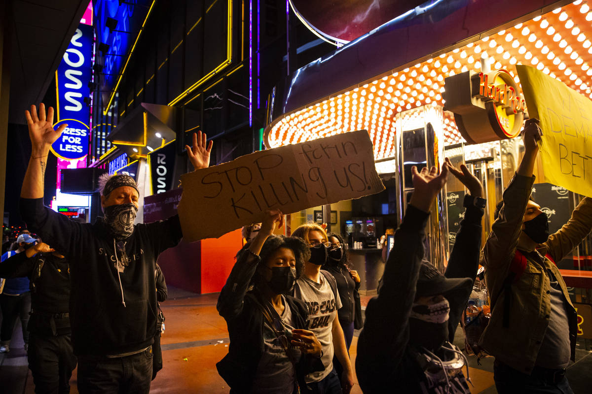 More than 100 people gathered under the lights of the Strip on Saturday night to protest recent police killings in the U.S. and the Clark County district attorney’s preliminary decision in the death of Jorge Gomez in Las Vegas.