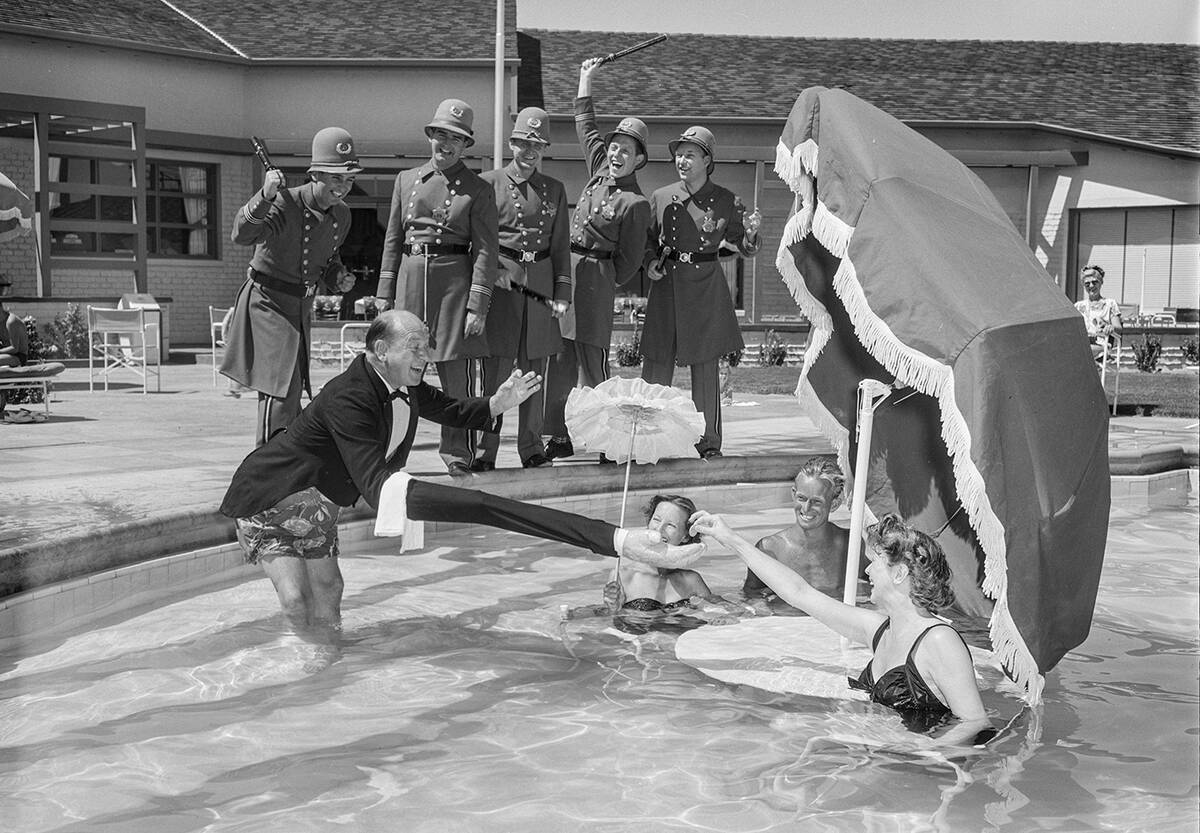 Frank Librise (butler) demonstrates how to keep cool and enjoy lunch during a photo shoot at the Thunderbird pool circa 1950. (Las Vegas News Bureau)