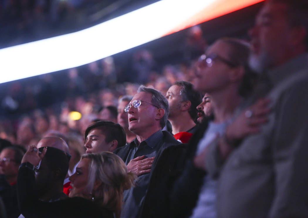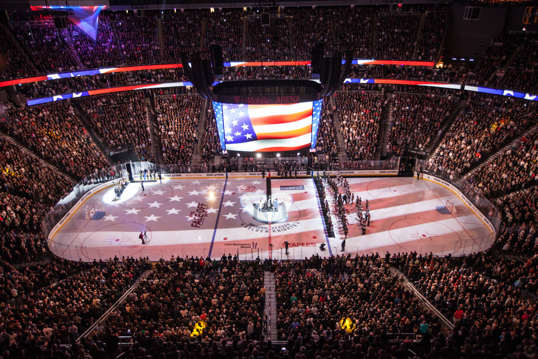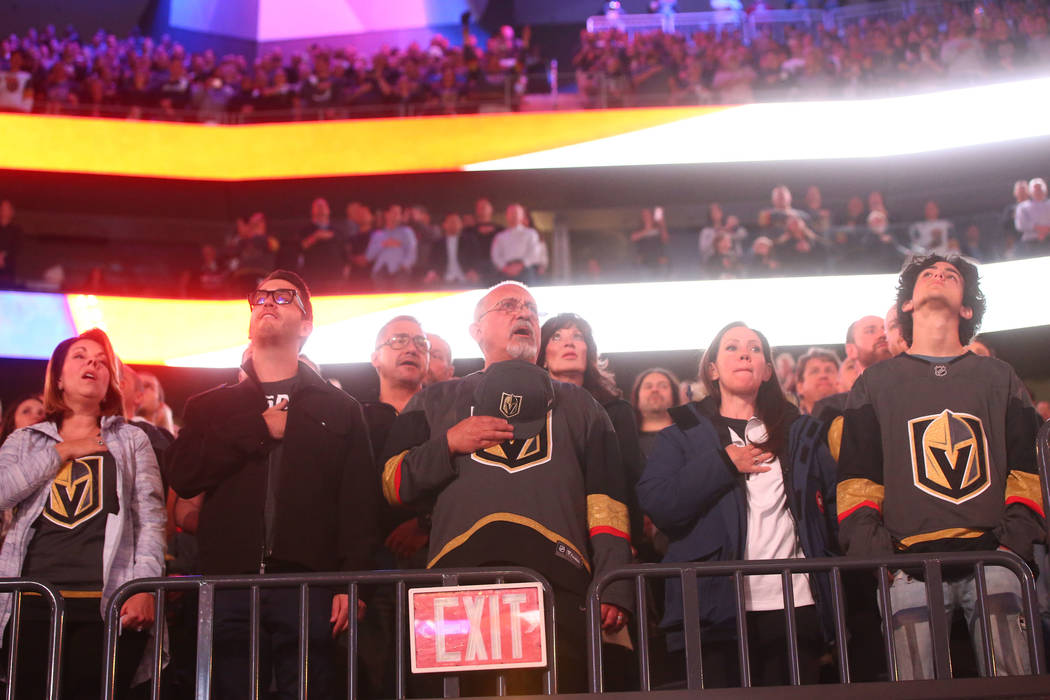 Fans sing the national anthem before an NHL hockey game between the Vegas Golden Knights and Arizona Coyotes at T-Mobile Arena in Las Vegas on Tuesday, Oct. 10, 2017. Chase Stevens Las Vegas Review-Journal @csstevensphoto
