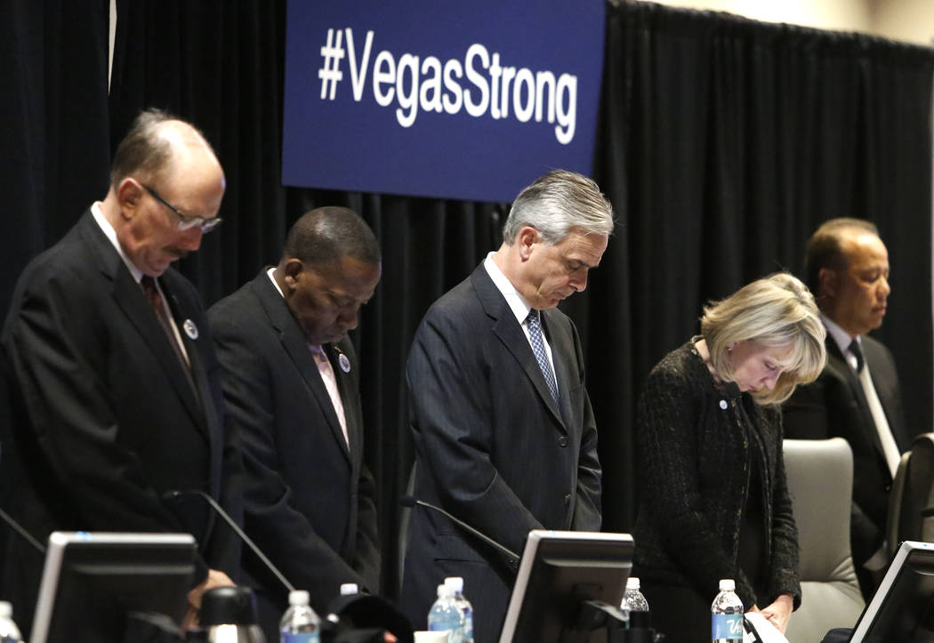 County Commissioner Lawrence Weekly, second left, Chuck Bowling, center, president and chief operating officer of the Mandalay Bay Resort and Casino and Kristin McMillan, second right, bow their heads during prayer at the Las Vegas Convention and Visitors Authority board of directors meeting on Tuesday, Oct. 10, 2017, in Las Vegas. Bizuayehu Tesfaye Las Vegas Review-Journal @bizutesfaye