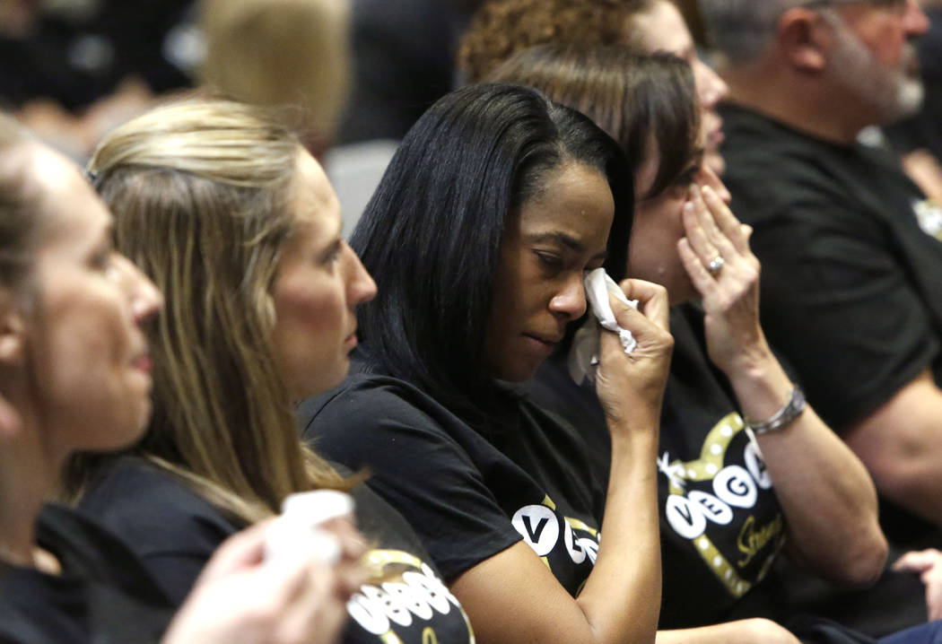 Lindsey Patterson, third left, and Yanick Dalhouse, right, get emotional as they watch a video honoring the victims of the Route 91 Harvest festival mass shooting, during the Las Vegas Convention and Visitors Authority board of directors meeting Tuesday, Oct. 10, 2017, in Las Vegas. Bizuayehu Tesfaye Las Vegas Review-Journal @bizutesfaye