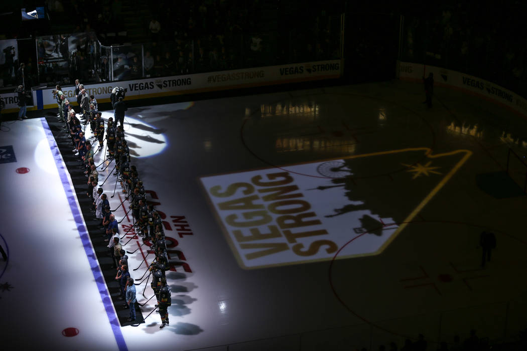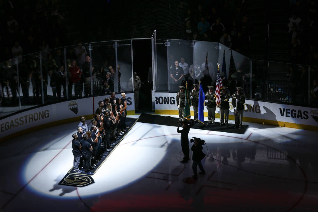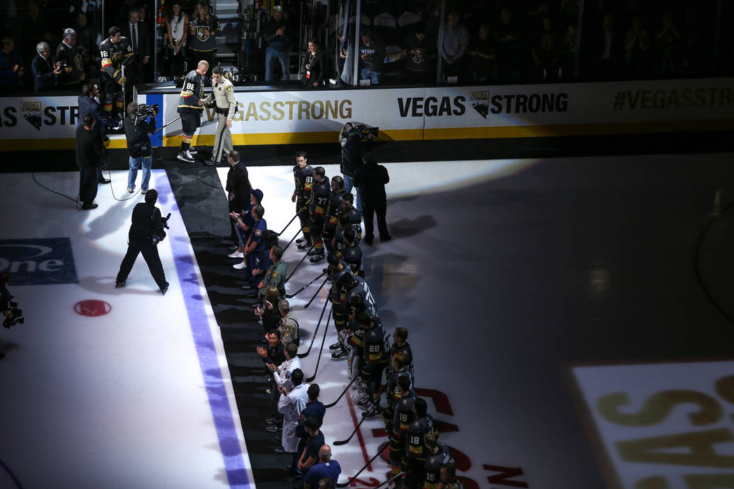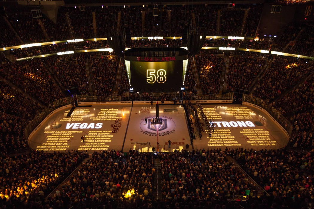A ceremony honoring victims and first responders of the Route 91 Harvest Festival shooting before the start of an NHL hockey game between the Vegas Golden Knights and the Arizona Coyotes at T-Mobile Arena in Las Vegas, Tuesday, Oct. 10, 2017. Joel Angel Juarez Las Vegas Review-Journal @jajuarezphoto