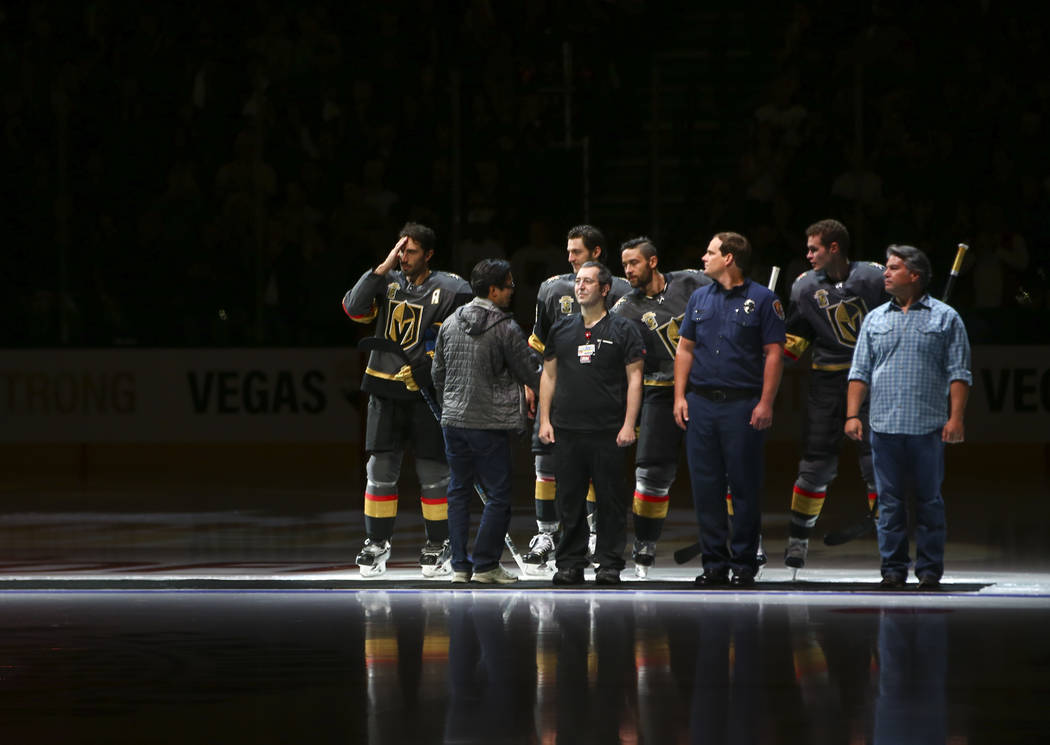 Members of the Vegas Golden Knights are introduced with first responders before playing the Arizona Coyotes in an NHL hockey game at T-Mobile Arena in Las Vegas on Tuesday, Oct. 10, 2017. Chase Stevens Las Vegas Review-Journal @csstevensphoto