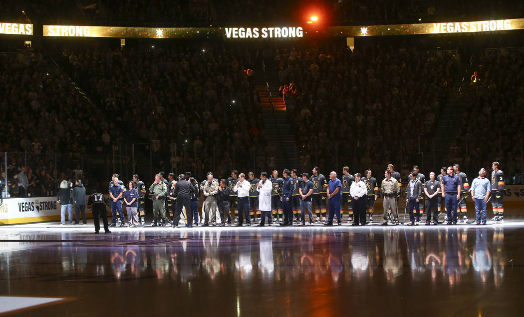 Victims and first responders of the Route 91 Harvest Festival shooting are honored before the start of an NHL hockey game between the Vegas Golden Knights and the Arizona Coyotes at T-Mobile Arena in Las Vegas, Tuesday, Oct. 10, 2017. Joel Angel Juarez Las Vegas Review-Journal @jajuarezphoto