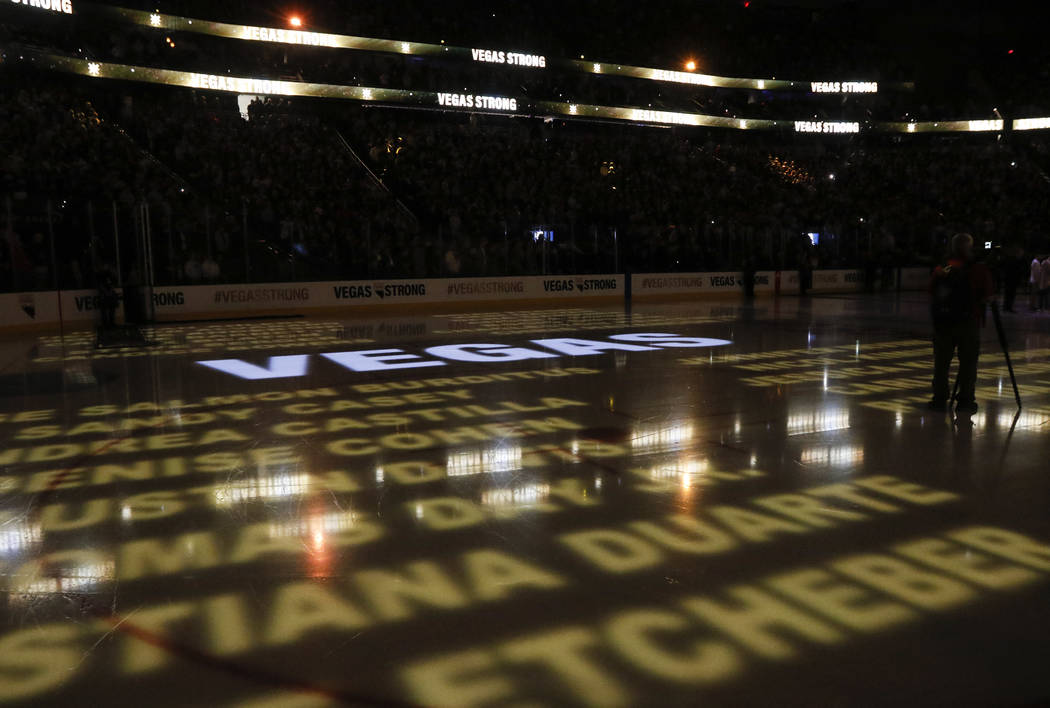 Names of the 58 people killed in the Route 91 Harvest Festival shooting are displayed on the ice before the start of an NHL hockey game between the Vegas Golden Knights and the Arizona Coyotes at T-Mobile Arena in Las Vegas, Tuesday, Oct. 10, 2017. Joel Angel Juarez Las Vegas Review-Journal @jajuarezphoto