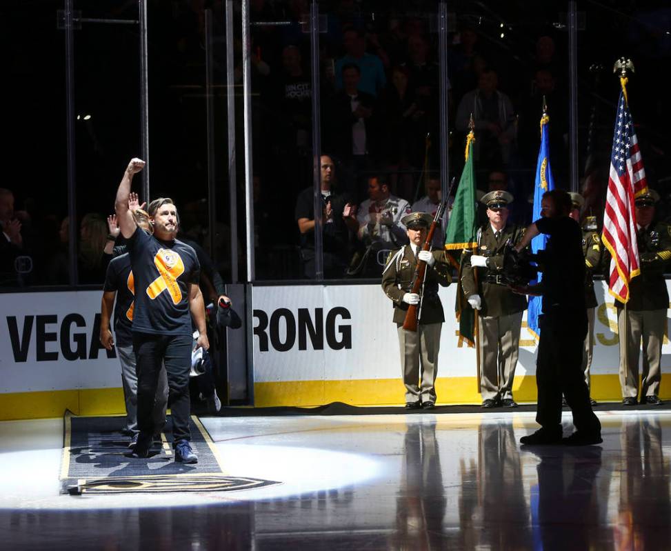 Members of the Route 91 festival team are introduced before an NHL hockey game between the Vegas Golden Knights and Arizona Coyotes at T-Mobile Arena in Las Vegas on Tuesday, Oct. 10, 2017. Chase Stevens Las Vegas Review-Journal @csstevensphoto
