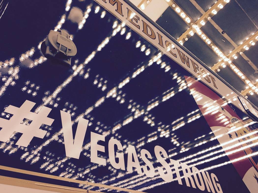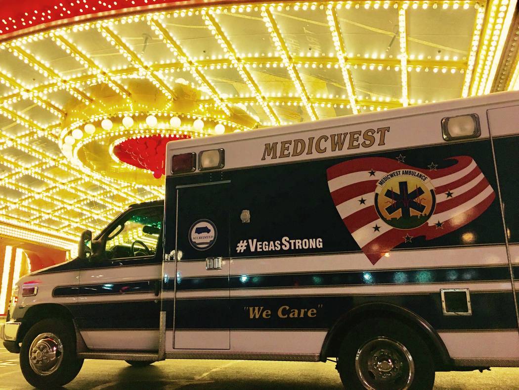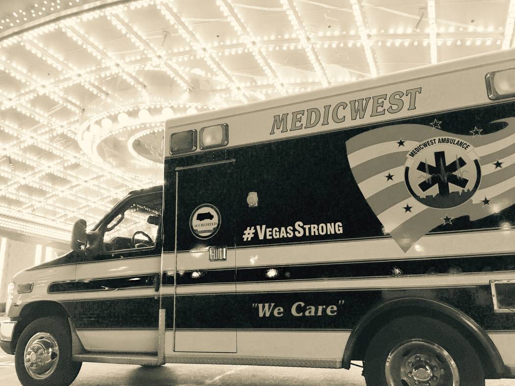 An ambulance in the MedicWest fleet with #VegasStrong decals in the lights of the Circus Circus valet. Photo submitted by Ricky Yeager