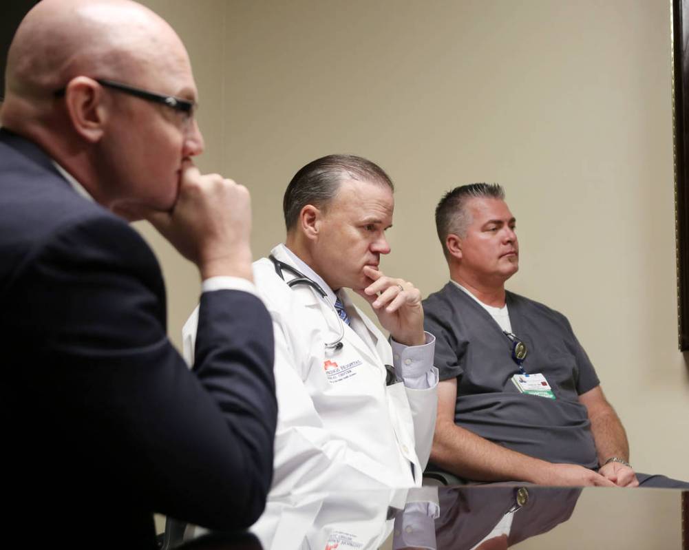CEO of Desert Springs Hospital Ryan Jensen, left, and hospitalist Lonnie Empey, and emergency room clinical supervisor David Barrett, at Desert Springs Hospital in Las Vegas, Tuesday, Oct. 10, 2017, recall working the night of the mass shooting. Elizabeth Brumley Las Vegas Review-Journal @EliPagePhoto