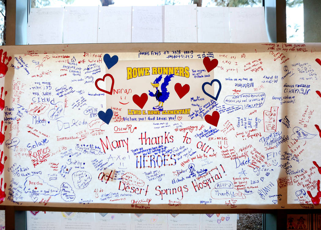 Lewis E. Rowe Elementary school’s banner of encouragement for the staff of Desert Springs Hospital hangs in the hallway of the hospital, in Las Vegas, Tuesday, Oct. 10, 2017. Elizabeth Brumley Las Vegas Review-Journal @EliPagePhoto