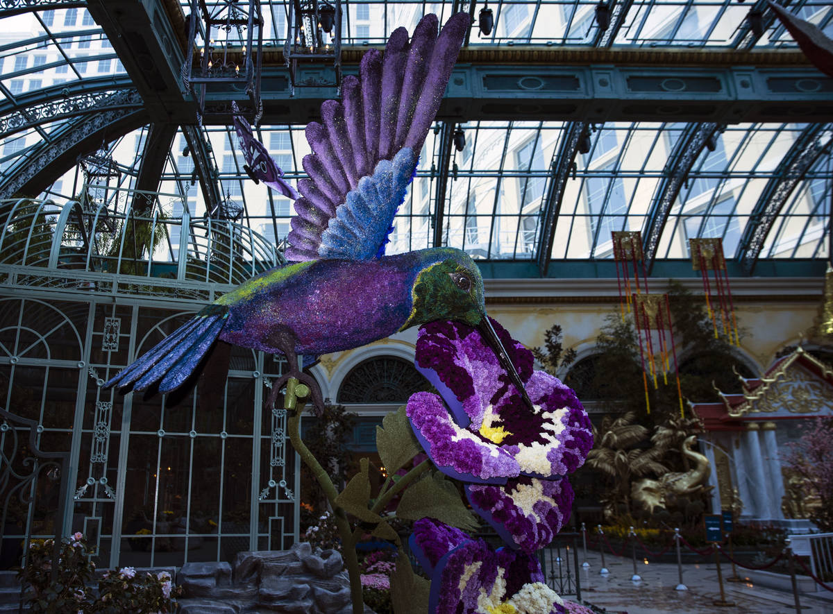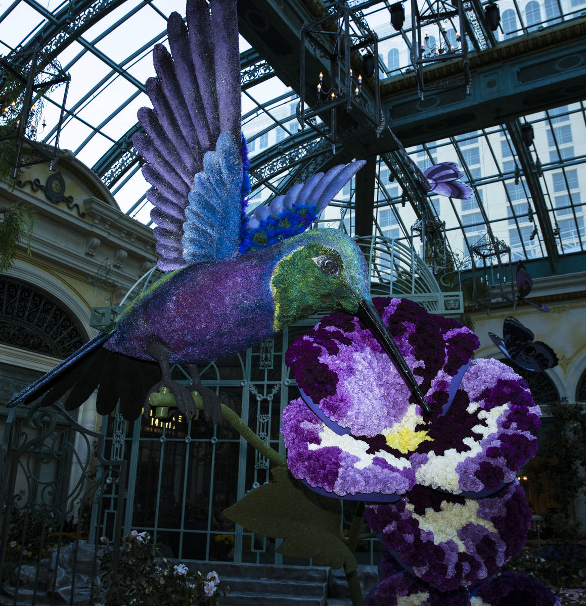 A giant hummingbird is displayed at the Chelsea Garden at the Bellagio Conservatory, honoring the springtime celebration in England, on Monday, March, 15, 2021, in Las Vegas. (Bizuayehu Tesfaye/Las Vegas Review-Journal) @bizutesfaye
