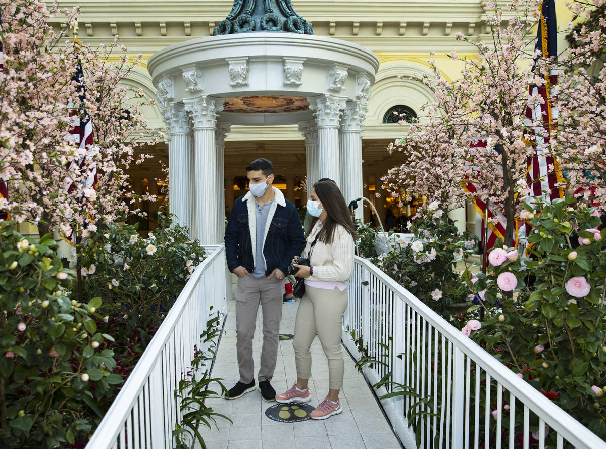 Elena Maican and her fiancee Paul Soto of Washington D.C., visit the Washington D.C. Cherry Blossom Festival display at the Bellagio Conservatory, on Monday, March, 15, 2021, in Las Vegas. (Bizuayehu Tesfaye/Las Vegas Review-Journal) @bizutesfaye