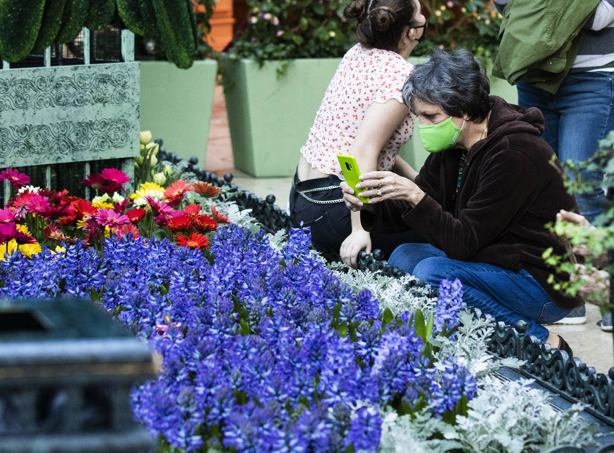 Vicki Cavenah of Tulsa, Okla., takes a picture of the Chelsea Garden at the Bellagio Conservatory at Bellagio on Monday, March, 15, 2021, in Las Vegas. (Bizuayehu Tesfaye/Las Vegas Review-Journal) @bizutesfaye