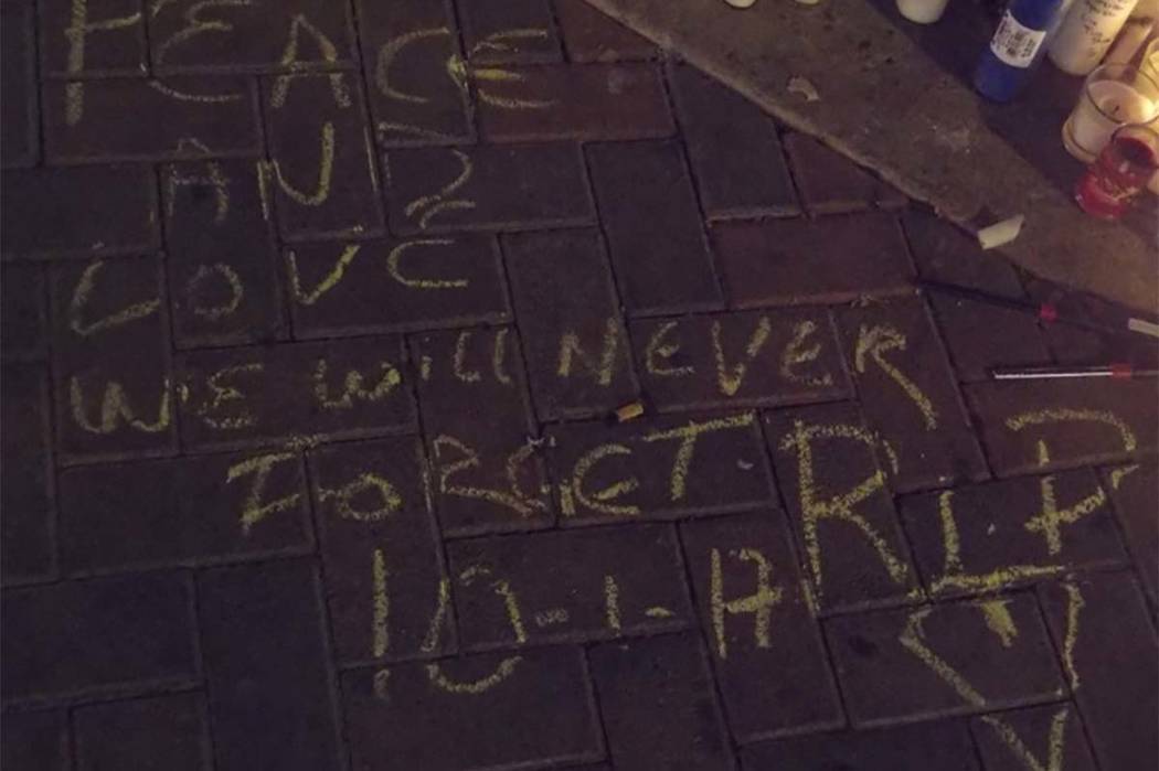 Locals stopped and knelt in the crosswalk next to tourists from around the world, lighting and relighting candles as the wind blew them out. A poster covered in handwritten messages of hope and prayer sat nestled between votive candles.