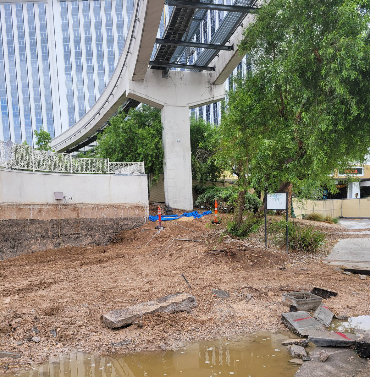 In October, The Boring Company got a notice of violation related to crews carrying out grading operations near the Westgate’s porte cochere on a demolition permit, county records show. The violation noted that a different monorail column was exposed during that incident.