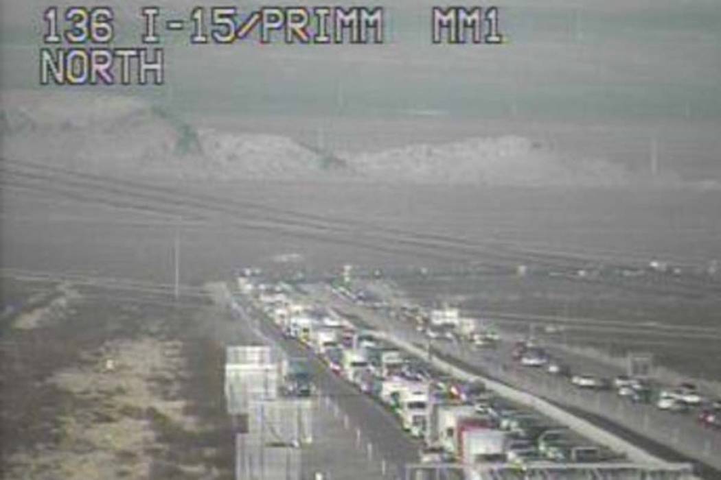 Department of Transportation live traffic cameras showed backups about 3 p.m. on the 15 in both directions near Primm.