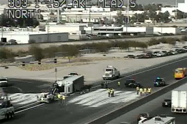 The RTC traffic cameras show a semitrailer on its side and several emergency vehicles in the area. No one is trapped in the vehicle, according to a tweet from the Las Vegas Fire Department.